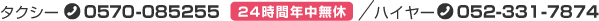 • 名タクを呼ぶ・予約する 24時間年中無休 タクシー 0570-085255 052-331-2222 ハイヤー 052-331-7874