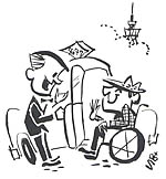 | 介助タクシーをご存じかどうか。昨年から当社が始めた新サービスである。体の不自由なお客さまに気持ちよく利用していただく。そこで乗務員が乗降のお手伝いをというもの。 その一員になった。母親が長年、車いすの世話になっているだけに、介助への関心が深かったこともある。こうしたサービスが、気軽に外出を楽しんでいただくきっかけになれば、との思いもあった。で、しかるべき講習を受け、車いすから座席への移動のコツ、体の支え方などを教わったのである。 こうして介助タクシー乗務員としてハンドルを握ったのだが、少々面食らったことがある。たとえば後部ドアを手で開けながら車いすのお客さまにお手伝いを申し出る。すると(腕が不自由な方は別だが)ほとんどの場合はにこやかに辞退し、自分自身でするりと座席に乗り込まれるのだ。これは思いのほかだった。何が何でも介助をという、当方の気負いをやんわりとたしなめられた気分だった。 そういえば、以前ならまず、付き添いの人が同情したものだが、最近は車いすの方が一人気軽にタクシーを呼び止める。みなさん活動的なのである。先日ご利用いただいた年配の男性は、繁華街へ遊びに出かけるところで、終始ご機嫌、話題も豊富で大いに盛り上がった。観劇が趣味で、毎月タクシーで御園座や中日劇場へ出かけるご婦人もいた。 こうした経験から、やっと気がついた。考えれば当たり前なのだが、車いすの方が、何も特別なお客さまではないのである。介助というのは、ことさら構えることではない。話上手なお客さまの話題に思わず興味をそそられるように、ごく自然に振る舞えばいいだけなのだ。そう納得してからは、ドアの開け閉め一つにも余裕が生まれた。乗り移るときに難儀そうな場合だけ、自然に手を貸すことができるようになったのである。 お客さまとの呼吸がぴったり合う。この接客の極意を、介助を通して学んだといってもいい。以来、自然流のハンドル業務を続けているが、残念なことが一つだけ。狭い道路で停車して乗降の手助けをしていると、後続車がクラクションを鳴らして急がすこともたびたびある。助け合いはお互いさまの社会だ。もう少しご配慮願えればありがたいのだが。 |