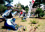 さて次は本家本元、決戦場の関ケ原町へ。大垣から国道21号線を西にわずか30分のドライブです。もちろんこちらも400年記念事業の花盛り。さっそくメイン会場の「関ケ原合戦特別展」開催中の歴史民俗資料館へ。一味違うのは、敗軍の将、石田三成にスポットを当て、西軍から見た関ケ原合戦をテーマにしていること。東軍に寝返った小早川秀秋や敵中突破した島津義弘隊の真相は…。小学生からお年寄りのグループまで、幅広い来場者がパネルを熱心に眺める様子からも、企画の面白さが伝わってきます。 同館から北西に車で5分も走れば、そこが決戦地の笹尾山。広々とした田園の畔の一角に決戦跡の碑が。仕入れたばかりの戦いの知識を胸に碑を眺めると、初夏の草いきれとともに「つわものどもが夢のあと」の名文句が浮かんできます。 田園地帯をちょいと下って国道365号線を西進し、その「夢のあと」を再現した「関ケ原ウォーランド」にも立ち寄りました。約3万平方bの敷地に、東西両軍の陣地を配し、実物大の武士や軍馬の像がずらり。そのかたわらでは家族連れがランチを楽しんでいるのも好対照。三成や家康も苦笑していることでしょうね、きっと。 |