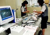 「タクシー運賃は便利なチケットで」という名タクのお客さまはどんどん増え、現在約3万口座。1日に利用されるチケットは約2万枚にのぼります。その集計、処理にはコンビュータの力が欠かせません。 その一つ、「タクシーチケット分類集計システム」。チケットの左下にある数字を指示に従ってOCR(光学的文字認識装置)が瞬時に読み取り、12のポケットに分類します。これを5−6回繰り返せば、ほぼ口座毎に細分化されるというわけです。1分間に処理する枚数は約400枚。操作は女子社員が交替で行っています。 実はこのシステム、今年8月から稼働を始めたニューフェース。銀行の小切手などを選別するソフトを応用したもので、10年前から準備を進め、今年2500万円かけて導入が実現しました。