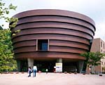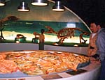 まずは瑞浪市化石博物館へ。中央自動車道瑞浪インター出口の表示板からわずか5分で到着です。新緑も鮮やかな丘陵地。付近一帯は1700万年前の地層におおわれていて、今までに1200種類を超す化石が見つかっています。日本どころか世界でも有名な化石の宝庫なんですね。 びっくりするのは貝類の化石が多いこと。つまり大昔、瑞浪は海の底だったというわけです。実際、博物館の横に掘られた地下壕の天井にはカガミガイやハマグリなど貝化石が露出しているから、信じないわけにはいきません。館内はもっとすごい。真珠の化石や歯クジラの頭骨を始め、哺乳類デスモスチルスの化石など珍しい展示がいっぱい。太古の物語にひたるにはうってつけの施設です。 この物語をもっと遡りたいなら、博物館から歩いて5分の「地球回廊」がおすすめ。ここは全長240?の地下壕ミュージアム。真夏でも15度という涼しいトンネル内は、地球の誕生から恐竜時代、人類の出現まで、ハイビジョンや模型で紹介しています。 と、ここまで古代の歴史が解明されたのもほかならぬ科学技術の発達のおかげ。そこで隣接のサイエンスワールドにも立ち寄りました。ここは先端科学を気軽に体験できる科学館。パソコンで紙飛行機を作ったり、細胞やDNAを抽出したりと実験教室が目白押し。週末や夏休みは子供たちで大盛況とか。 |