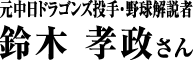 胸のすくような剛速球で、中日ファンの記憶に鮮やかな鈴木孝政さん。昭和48年の入団以来、あるときはリリーフ、あるときは先発として、17年間に数々の記録を残されました。現在は野球解説者としてもおなじみです。気さくなお人柄から、タクシーも楽しんで乗っておられるようでした。 村瀬 僕が鈴木さんの現役時代で一番印象に残っているのは、オールスター戦のときのスピード競争ですよ。 鈴木 ああ、山口高志さん(元阪急)と、セパ両リーグのスピード競演とか言われて。僕が21歳のときですね。 村瀬 勝ったでしょ、鈴木さんが。 鈴木 いえ、山口さんの方が速かったです。僕が選手時代、自分の目で確認して、一番速かったのが彼ですね。 村瀬 僕は鈴木さんの方が、速かった気がしますけど。 鈴木 中日ファンの方は、そう思ってらっしゃるんですけど(笑)。 村瀬 でもあんなにスピードが騒がれ出したのは、鈴木さんからじゃないですか。 鈴木 スピードガンが入ってきましたからね。最初に手に入れたのが広島さん。試合で僕が投げて、測ったんじゃないですか。次の日の新聞に、僕が155キロを計測したと出てたんです。結構うれしかったですね。 村瀬 そりゃそうでしょうね。 鈴木 そのとき米国のノーマン・ライアンが100マイル。160キロですね。「よし、あと5キロだ」なんて。随分、印象にありますね。 村瀬 ストッパーの先駆者なんですけど、先発をされた時期もおありで。先発のほうが楽じゃないですか。 鈴木 それは違いますよ。先発の辛さというのは、投げる日が決まっていることですね。前の晩なんか震えてますよ。打たれたらどうしようとか。僕はバース(元阪神)の顔が浮かんで、どれだけ寝られなかったか。 村瀬 ほお。 鈴木 一番いいバッターですからね、僕の中では。ストライクを投げたら、彼にだけは打たれると思いましたね。デッドボールも、自分から当てたのは彼に1回だけ。「少し休んでもらおう」と(笑)。右ひざ狙ったら、当たりました。一発で。いいコントロールしてましたね。でも「OK!」と言って、返って元気になりましたよ(笑)。 村瀬 選手時代にたくさんの記録を残されて、今も社会的地位を維持していらっしゃる。そういう意味では、トップクラスじゃないかと。そのくらい厳しい世界じゃないですか。 鈴木 厳しいです。選手時代のある日、自分が入団したときにいた約70人の選手が全部、いなくなったんですよ。そのときは家に帰って乾杯しました。サバイバルゲームに勝ったと思って。 村瀬 利用価値があるから残れるわけですからね。 鈴木 そうです。トレードにも出されなかったし。いっぱいありましたけどね、話は。ヤクルトの武上さんが監督のとき、神宮球場に行ったら呼ばれたんですよ。「お前はそんなに大事な選手か。うちがいい条件出してもくれない」と言われて。 村瀬 男冥利に尽きますね、それは。 鈴木 そうです。敵の監督だけど、「いい人だな」と(笑)。 村瀬 実は僕の女房も、鈴木さんのファンだったんですよ。モテたでしょうね、女性に。 鈴木 いやいや。僕は23で結婚しましたからね。高校のときからの付き合いですから、野球選手にならなくても一緒になってたと思いますけどね。 村瀬 幸せな結婚だったんですね。内助の功があったと。 鈴木 美化してやらないとね(笑)。でも野球選手の奥さんは大変ですよ。特にピッチャーは。成績が上がらないと女房にツケが回ることもあるし、わがままだし。寝るのと食べるのが仕事ですから。 村瀬 お仕事柄、あちこちでタクシーにお乗りになる機会も多いと思いますけど、何か印象深いご経験はおありですか。 鈴木 現役時代、アメリカに勉強に行ったんですね。で、ニューヨークでイエローキャブに乗って、「ケネディ・エアポート(空港)」と言ったら、通じないんですよ。その運転手、黒人だったんだけど、英語が分からないんです。道路標識も読めない。だから僕が標識を見ながら「こっち」「あっち」って。大変でしたね。 村瀬 そんな運転手もいるんですねー、向うには。 鈴木 うん。それと金沢でね。行き先は近くのホテルだったんだけど、真夏だし、すぐ中継があるしで、急いでたんですよ。それで行き先言ったら「バカにしとんのか、コラ」と降ろされた(笑)。荷物持って、歩いていきましたよ。みじめだったな、あれは。 村瀬 わが社では、近距離のお客さまを大切にするよう、徹底的に教育しているつもりですけどね。 鈴木 そうですか。気持ちは分かりますけどね。でも近距離もあれば遠いこともある。それが仕事ですからね。 村瀬 名古屋でお乗りになると、運転手は鈴木さんと分かるんじゃないですか。 鈴木 声で分かるんでしょうね。野球の好きな人は、ラジオで解説を聞いているから。飲んだ帰りに乗ると、「鈴木さん、今日は遅いですね」とかね(笑)。 村瀬 よく運転手とお話しになりますか。 鈴木 話す方です。どっちかというと、喜ばれるお客(笑)。僕はあちこち行ってるし、いろんな