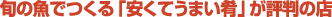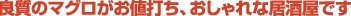 とくにマグロはオーナーの人脈で、マグロ漁船からほぼ直接買い付けに近いルートで良品が手に入るため、おいしいマグロが低価格で味わえます。しかもマグロの種類や部位の特徴を知った上で作られる料理の数々。頭肉、尾、ノドなど、珍しいメニューもあります。