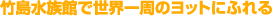 目の前に浮かぶ緑の小島が蒲郡のシンボル・竹島。その目と鼻の先にあるのが竹島水族館。入り口前に大きなヨットが飾られてあるからすぐわかる。実はこのヨット、エリカ号といって、世界中に知られているんですね。昭和56年、当時4歳7カ月の絵梨佳ちゃんと両親がこのヨットで約6万キロの世界一周大航海に出発、4年9カ月後、無事に蒲郡港に帰還しました。この壮挙の記念というわけですが、なにしろ本物、空に伸びる2本マストに夢をかきたてられます。