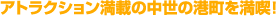 家族やグループで楽しむなら「ラグナシア」と呼ぶテーマパークでしょうね。とにかく凝っている。交易で栄えた中世の港町が再現されていて、石造りの大宮殿に神殿、波が打ち寄せる人工の海、カヌーが行き交う運河、それにジェットコースターやメリーゴーランドなどの遊園地と盛りだくさん。