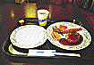昼食はラグナシアの宮殿にある「バシレイオン」でいただきました。ビュッフェ方式のメニューから選んだのはハンバーグ、エビフライに野菜の付け合せ、ご飯。