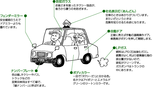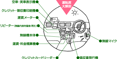 ※他にも、三角窓に張られた点字シール(会社名と無線番号を記載)や、タコグラフ(タクシーの走行状況を24時間記録するもの)などがあります。