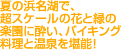 加えて、趣向がいっぱいの各テーマ館、コンサートなど楽しいイベント。しかも場所は、陽射しがきらめく浜名湖岸! 歩いているだけで気持ちが晴れ晴れとしてきます。