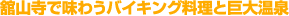 ランチバイキングはレストラン「ルピナス」で。午前11時半〜午後2時半(入場は1時半まで)。和洋中の前菜からスープ、料理各種、デザートまで50種類が楽しめる。料金は「ダイダラボッチの湯」とのセット券(浜名湖パルパル入場券、ロープウェイ乗車券も無料サービス)がおすすめ。大人3675円(平日)、3990円(土日祝、特定日)、小学生はそれぞれ2625円、2835円。