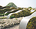 そこを抜ければ視界が一気に広がります。まず出迎えてくれたのが「ほほえみの庭」。これは独創的でした。カラフルな花壇が地面ではなく、垂直の壁に作られている。その花の壁が波のようにうねり、重なっている。向こうは富士に見立てた花の山。しかも花壁の間を歩くと、心地よい音楽が周囲から流れてきます。この花と音のシンフォニーは花博でしか味わえません。