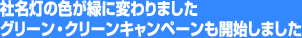 また、同時にゴミゼロ運動としてグリーン・クリーンキャンペーンを開始しました。社名灯の色がグリーンになったのを機会にタクシーの中はもちろん回りの環境もクリーンにしようというものです。乗務員はそれぞれがゴミ袋を用意し、車内で出したゴミやタバコの吸殻はもちろん、車の待機中に、できる範囲で周辺のゴミを拾い、少しでも町がきれいになるようにします。