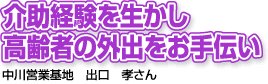 「高齢者や障がい者の方は、どうしても家に閉じこもりがちです。もっと外に出て、清々しい気持ちを味わっていただきたいと思うのですが、実際のところ車椅子から自動車への移動や、歩行の介助など、外出するとなると、ご本人はもちろん、付き添う人も大変です。そんな時、少しでもお手伝いできれば嬉しいですね」と出口さん。