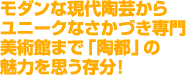 同美術館は国内外の近現代の陶芸作品、それに産業陶磁器など暮らしに密着した実用品の展示が特徴。オブジェや人形や器などがゆったりとした空間の中に展示されています。とりわけ開催中の企画展「イタリアの現代陶芸」では、冒険的な彫刻のような大物作品の迫力がすごい。焼物の可能性の広がりを改めて思い知らされますよ、きっと。