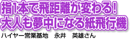 昨年は全日本紙飛行機選手権大会の予選を勝ち抜き、全国大会にも出場。やる気がどんどん膨らんでいる真っ最中です。永井さんの紙飛行機は、折り紙ではなく、市販のキッドを自分で組み立て、ゴムを使ってパチンコの要領で飛ばすもの。