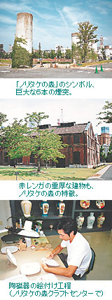 さて「ノリタケの森」は赤いレンガの建物と、地面からにょきりと生えた巨大な6本煙突が目印。世界的な総合食器メーカーに育った、その原点を思い起こすモニュメントということです。