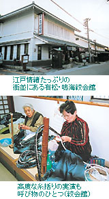 その絞りの技法を実演してくれるのが絞会館。江戸時代からの絞り染めの展示室、ビデオ上映室と並んで実演コーナーがあり、毎日、プロ職人の女性たちが鮮やかな手さばきで糸括りを見せてくれます。