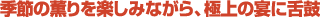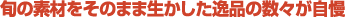 自慢は旬の素材をそのまま生かした逸品の数々。素材の持ち味を最大限に生かすために、毎日の仕入れ具合でメニューを決め、だし昆布や調味料も全国各地から取り寄せています。お勧めの筆頭は新鮮な魚介類。生マグロ(900円)、天然ヒラメ、サンマなど刺身は日替わりで5種。焼きガニ(一匹1000〜3500円)をはじめ、タラバガニやワタリガニの料理を年中堪能できるのも特長です。