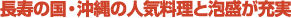 沖縄料理といえば、ゴーヤなど太陽をいっぱいに浴びた島ヤサイや、コラーゲンたっぷりのラフテーやミミガー、そして美しい海に育まれた海ぶどうや魚介類…。