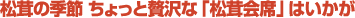 また家族連れでにぎわう夜。この時期のお勧めは何といっても秋の味覚の王者・松茸が主役の「松茸会席」(写真、5500円)。松茸の土瓶蒸し、焼き松茸の握り寿司、松茸入りの地鶏鍋などなど、贅沢なラインアップです。こちらは10月中旬まで要予約でいただけます。