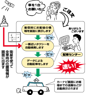新システムでは、お客様からご注文の電話を受けると、ご要望の場所の近くにいるタクシーをコンピュータが瞬時に検索。配車係がその車にご注文内容をデータ送信すると、タクシー車内にある最新式のカーナビに、お客様までの道順など配車に必要な情報が瞬時に表示され、正確にすばやく配車できます。
