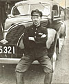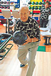 長寿ボウラーの「西の横綱」として、96歳の今もなお現役でボウリングを楽しんでいる松井勇一さん。かつては名タクにドライバーとして在籍した先輩でもあり、昔の記憶はくっきりハッキリ。昭和10年代のタクシー事情から健康の秘訣まで、たっぷり伺いました。 金子 西日本で最高齢のボウラーだと伺いましたが、お元気でいらっしゃいますねー。毎週のように、ボウリングをなさっているんですか。松井 はい。週1回は行って、3〜4ゲーム投げています。今年2月にはボウリング場が誕生祝いをやってくれまして、テレビや新聞各紙が取り上げてくれました。 金子 スコアはどのくらいなんですか。 松井 私は92歳でボウリングを始めたんですが、93歳のとき215を出しました。最近はちょっと足腰が弱くなって、平均120くらいですかね。 金子 そうですか。今もご自分で車を運転していらっしゃるそうで。 松井 はい。今年2月に免許の更新があったんですが、目の検査にとおって、まだ大型2種を持っています。観光バスにも乗れるのが自慢です。「だれも乗ってくれないけどな」と言われますが。(笑) 金子 それもすごいことですね。 松井 私は昭和4年に免許証をもらってから、今まで無事故なんですよ。表彰もされました。違反はありますよ。一昨年も、農道を走っていたらスピードで引っかかった。免許証を見た警察官が「あんた、明治生まれですか」と言うから、「明治なら許してくれる?」と言ったら、「ダメです」(笑)。24キロオーバーでした。 金子 名タクにお入りになったのはいつごろですか? 松井 昭和13年くらいでしたか。私は3つのときにオヤジを亡くして、お袋一人で貧乏のどん底。大正14年に小学校を卒業して、名古屋のフォードの修理工場に住み込みで入ったのですが、「タクシードライバーになっていいカッコしたいな」と思った。でも方法が分からないんです。だから昭和8年に、市営バスの運転手を募集していたので試験を受けて、しばらく勤めて名古屋の地理を覚えてから、名タクさんに入ったんですね。 金子 なるほど。市営バスは入りやすかったんですか。 松井 いえ、120人受けて7人合格しただけです。実地試験はもちろんですけど、学科試験が非常に難しいんですね。3問だけなんです。「自動車は如何にして動くか」、「自動車とは如何」、「作動装置の図解説明と名称を記せ」。それだけ。 金子 整備の知識もないといけないんですね。 松井 はい。自動車のピン1本を見てどこのピンか分からないと、受からないです。それから交通法規や、地理ですね。 金子 バスの運転手とタクシー運転手で、収入はどちらがよかったんですか。 松井 市営バスのときは月給が55円くらいで、名タクはそれよりよかったですね。代用教員が17〜18円くらいの時代です。 金子 これ(右の写真)はいつごろのお写真ですか。なかなかいい男ですね。(笑)松井 昭和14年かな。車は1937年型のフォードです。名タクはフォードがほとんどでした。当時は2マイルまでが50銭。しばらくしてから値上げされて、2キロ50銭になりました。 金子 マイルからキロになったんですね。 松井 そうです。それまではガソリンもガロン。1斗缶1本が1円1銭と記憶しています。 金子 お客様は、どんな感じだったんですか。 松井 まずね、車に乗ったら、50銭か1円はチップを置くと決まっている。これが大きい(笑)。そのころのタクシーのあだ名は「雲助」。ガラの悪いときもあったんです。名古屋駅でお客さまを待っていると、それぞれのタクシー会社のポーターが、お客様の取り合いで。荷物は向こうの会社が持っていく、ご本人は名タクに乗っているとか。(笑) 金子 なるほど。 松井 祝言の送迎に行くと祝儀をもらえたんですが、盛大な式の割に祝儀が少ないときは、猛スピードで走ったり(笑)。そうかと思うと、農家の人が娘の祝言に行くのに、白茶けてしまったような紋付きと黄ばんだようなシャツを着ていて、50銭の祝儀をくれた。こんなありがたいことはないと、私は忘れません。 金子 運転手に祝儀を出すのは普通だったんですか。 松井 そうですね。だいたい2〜3円は出たものです。一番多かったときは、乗り降りのたびにいただきまして、最後に数えたら55円ありました。 金子 当時の乗務員教育については、何か覚えていらっしゃいますか。 松井 お客様が降りるときはドアを手で開けて、「ありがとうございました」と頭を下げながら、お忘れ物がないか車内を見回すと。それはよく言われました。 金子 今に生きていますね。 金子 戦後もずっと運転手をされて、その後、車の修理工場を始められたそうですね。松井 はい。長年の夢だったんですが、工場も2棟になり、子供から孫へと継いでいてくれます。だからもう満足ですね。よく子供たちに言うんです。「自分は金も何もないけど、人の持たない財産を持っている。それは2日や3日食べなくても、人と一緒に仕事をするバイタリティだ」と。貧乏で育ったおかげで、今日の自分があると思