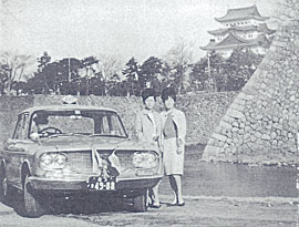 写真は名古屋城をバックに、お正月の飾りをつけた名タク車両と女子社員。車両と社名灯が新しくなった最初の写真です。