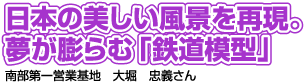 山や海、川や森など、日本の美しい風景をジオラマで再現し、そこに橋やトンネルを作ってレールを通し、ミニチュアの列車を走らせる…。