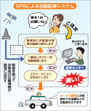 11月1日から無線機をデジタル方式に変更し、配車システムを一新します。人工衛星と、全車に搭載するカーナビを活用して、お客様に一番近い車両を、いつでも、どこでも、迅速に自動配車します。 |  |