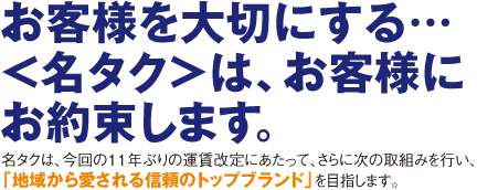 今回の運賃改定の条件である乗務員の待遇改善について、社是の「従業員を大切にする」に基づき、賃金及び福利厚生の面で、これまで以上に、地域最高の待遇をめざします。 |