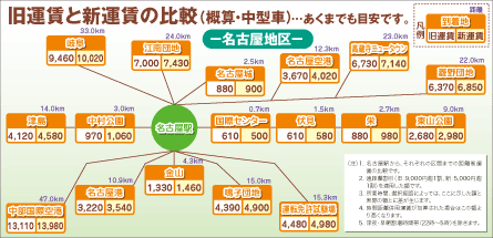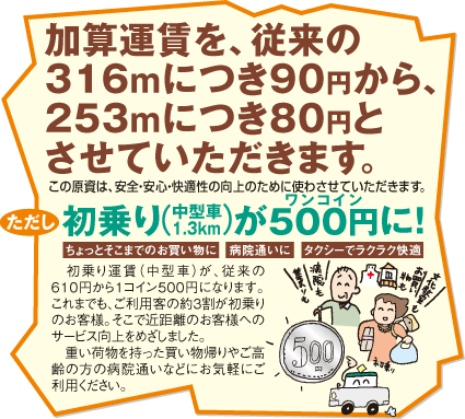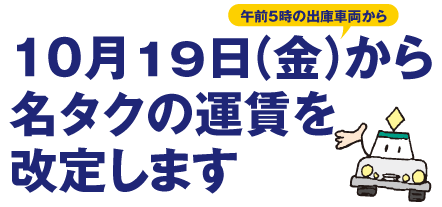 当社では10月19日午前5時の出庫車両から運賃を改定いたします。主な内容は次のとおりです。お客様の、より身近で安全、安心、親切、快適な足として、サービス向上のための取組みにも力を入れていきます。